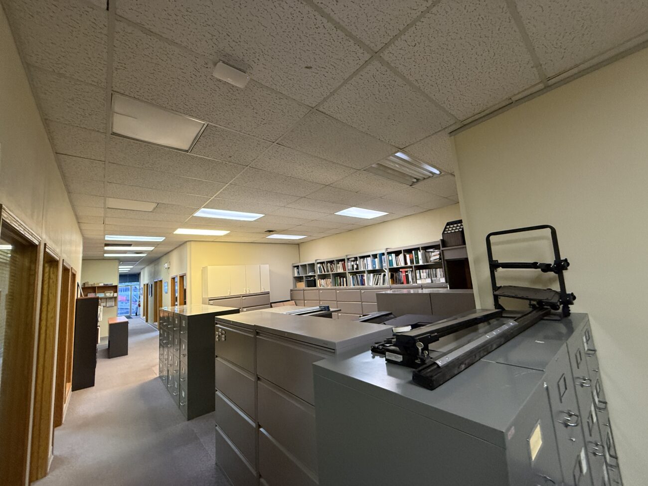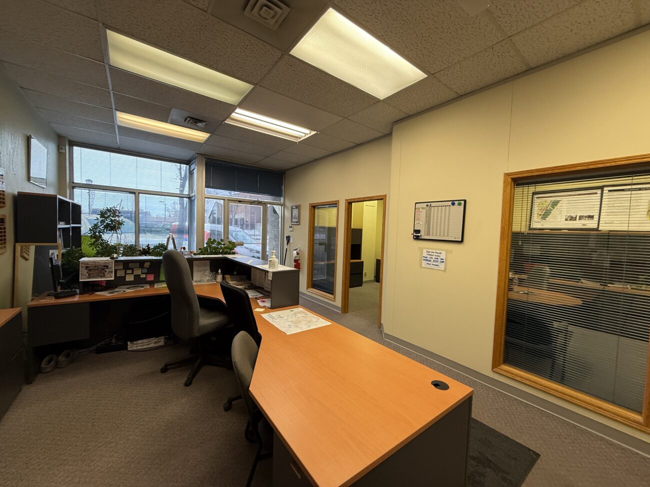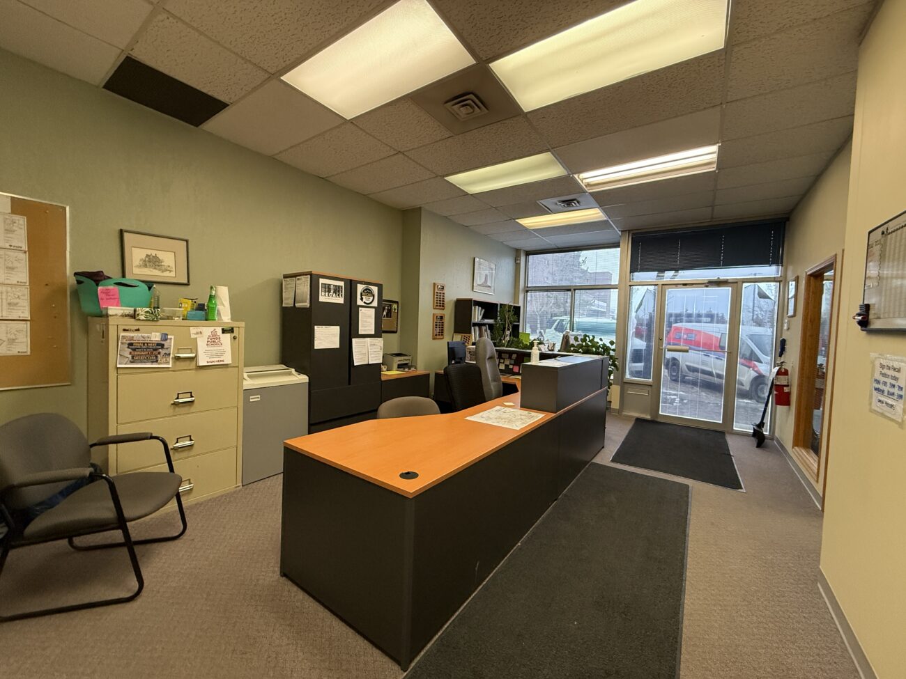 Inside, the layout includes a welcoming open reception and waiting area, multiple generously sized private offices, a versatile file room or bullpen space, a kitchenette, and a private washroom. A separate rear entrance provides convenient access for staff, leading to three designated parking stalls at the back of the building.