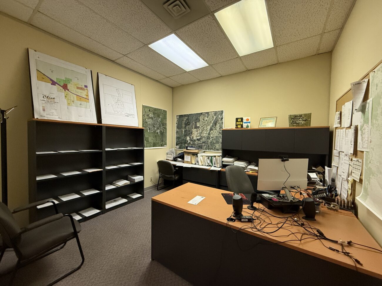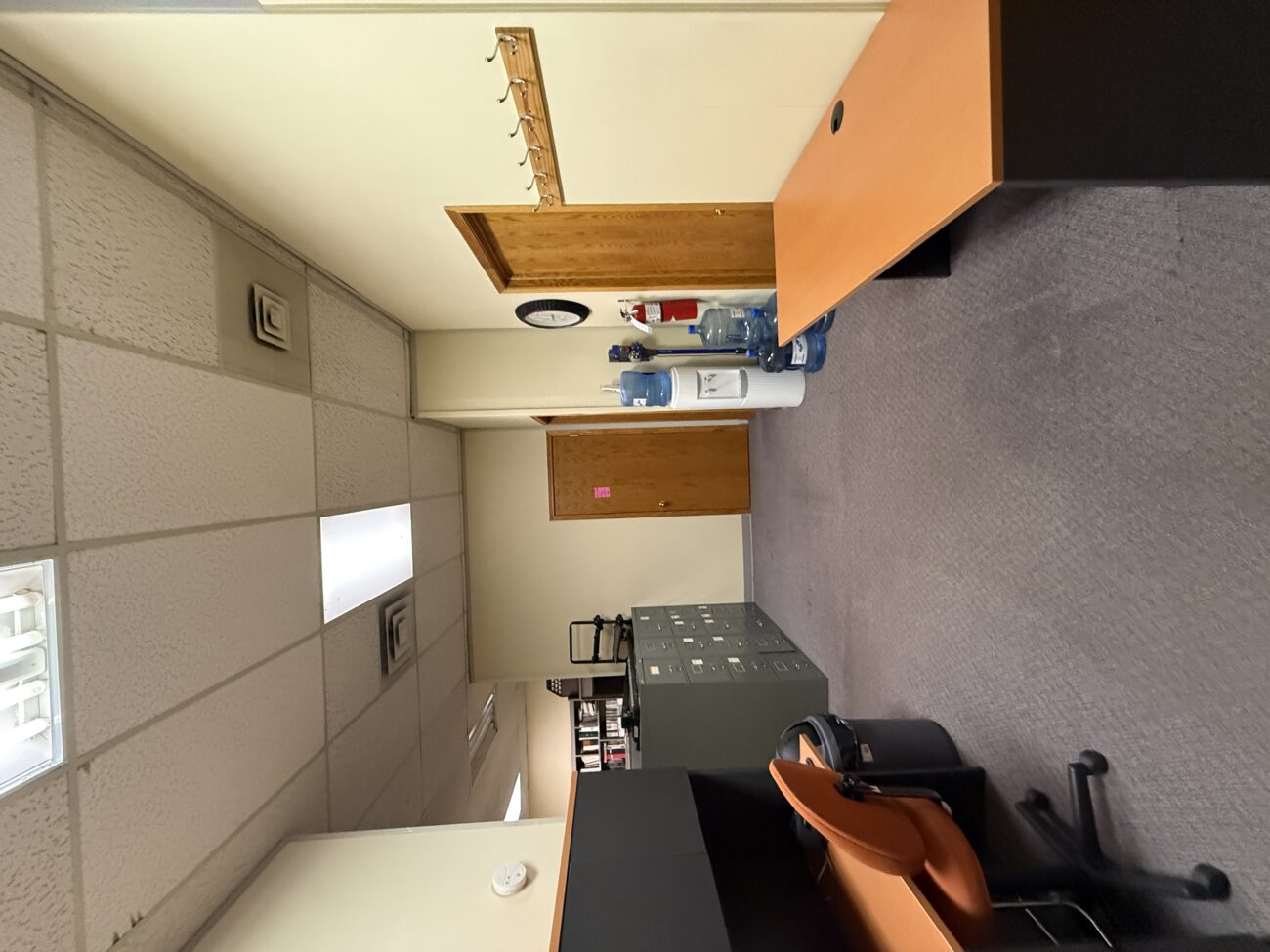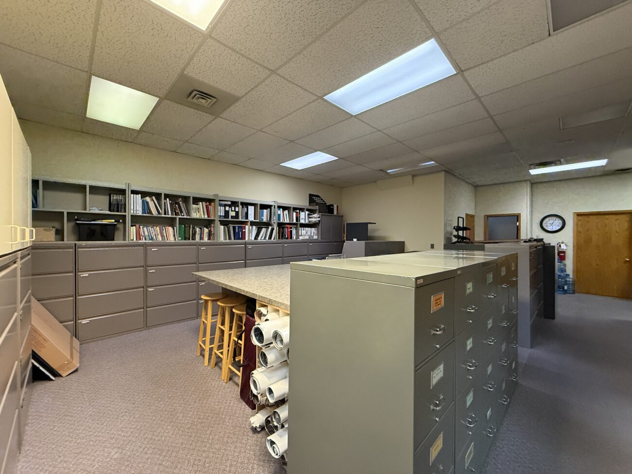 Inside, the layout includes a welcoming open reception and waiting area, multiple generously sized private offices, a versatile file room or bullpen space, a kitchenette, and a private washroom. A separate rear entrance provides convenient access for staff, leading to three designated parking stalls at the back of the building.